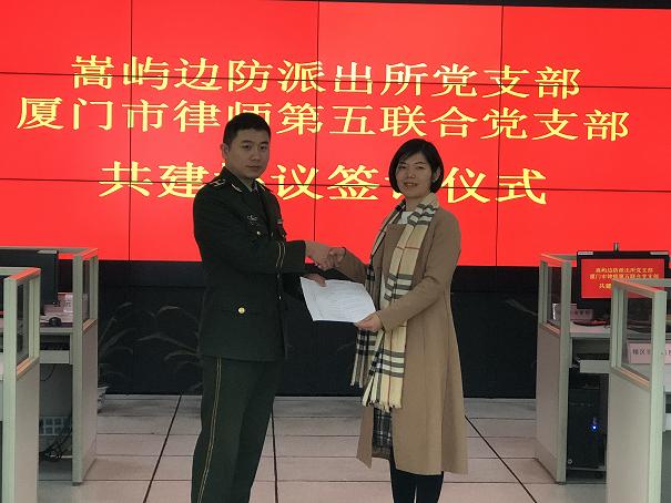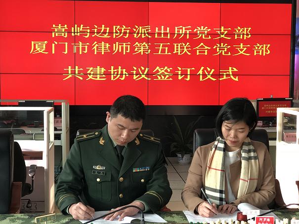 2018年3月9日下午,廈門市律師第五聯合黨支部與海滄嵩嶼邊防派出所黨支部簽署了支部共建協議,確立雙方為黨建結對子共建單位。福建冠德律師事務所合伙人、副主任、廈門市律師第五聯合黨支部書記黃芬嫘出席了簽訂儀式并共同見簽,開啟了雙方黨建、法律共同體建設互促共贏的新模式。