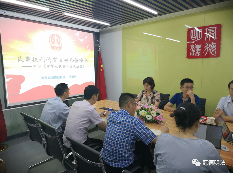 剛結束美麗的東山游,又馬不停蹄的回到民法典的學習中。9月21日福建冠德律師事務所邀請到了中共泉州市委黨校科學社會主義與法學教研室副主任、法學學科負責人、法學副教授吳敬南同志為大家授課“民事權利的宣言書和保障書——學習《中華人民共和國民法典》。吳教授從民法典7編1260條結合實際案例系統(tǒng)論述,讓大家受益匪淺。