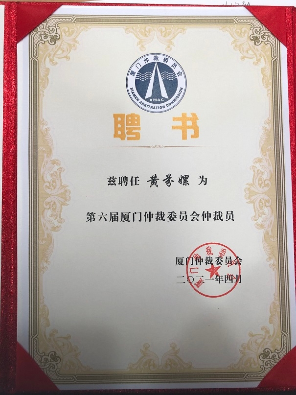 熱烈祝賀福建冠德律師事務所支部書記黃芬嫘律師榮幸受聘為廈門仲裁委員會仲裁員